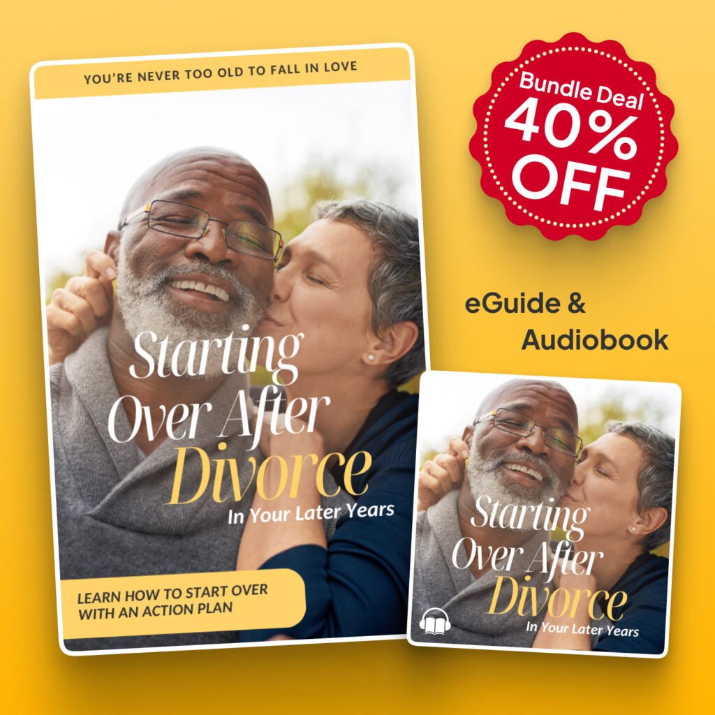 Our eGuide and audiobook offers practical tips and gentle encouragement for anyone rebuilding life after divorce in their 40s, 50s, and beyond. Inside, you’ll find guidance on healing emotionally, regaining confidence, rediscovering joy, and creating a fresh plan for your future. Designed to be simple, supportive, and action-focused, this guide helps you take meaningful steps toward a new beginning.